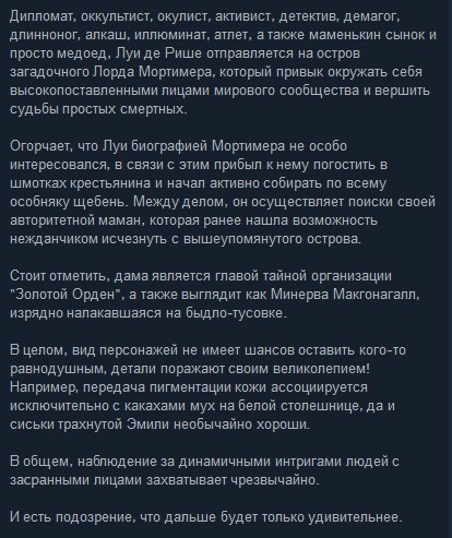 У нас было 2 дня гостей,а у меня продолжаются дни тупняка. Из достижений : наблюдала,как можно совсем по другому проходить Балду, ела,как не в себя и начала играть в Council. Спасибо,тебе мил человек,который его порекомендовал. Это почему-то малоизвестное интерактивное детективное кинцо,полное неведомой херни и словестных баталий. Пока от силы погоняла пару часов за окультиста (очень надеюсь,что не ошиблась с выбором профессии) и уже успела пару раз крупно ...кхм...профукать пару важных вещей. Выборы бесповоротны. Отсылки на реальных персонажей и организации забавен. Интригующе.